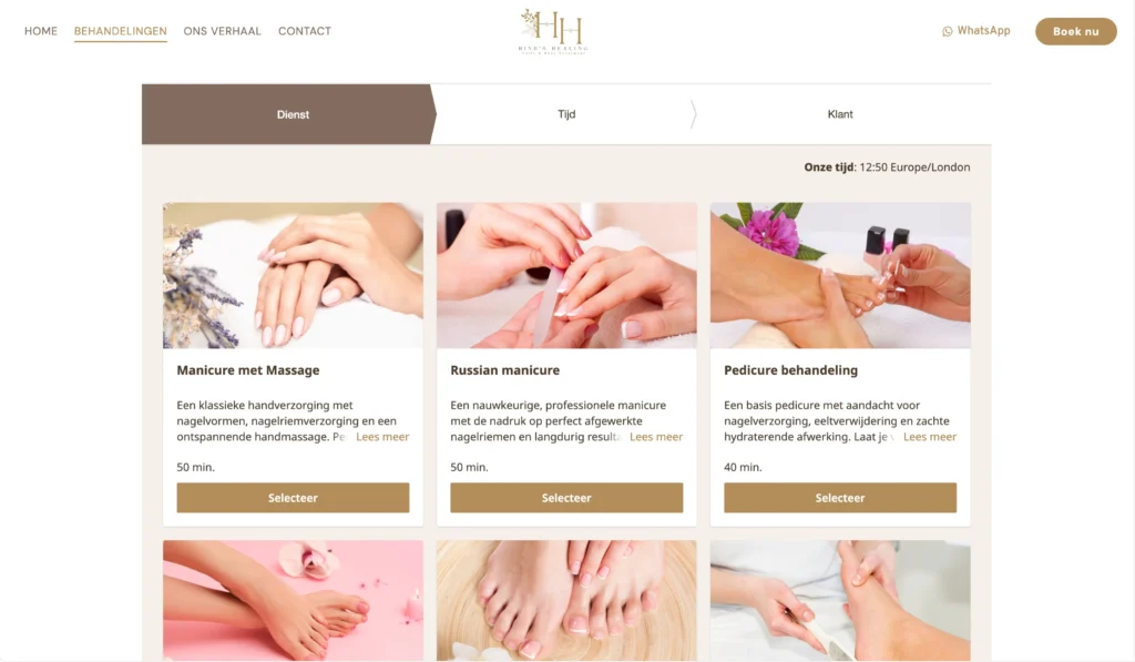Hind’s Healing is a Rotterdam-based beauty and wellness studio offering nail, skincare, and relaxation treatments. The client needed a warm, feminine, and trustworthy online presence that would highlight self-care services, convey calm through design, and allow customers to easily book appointments online.